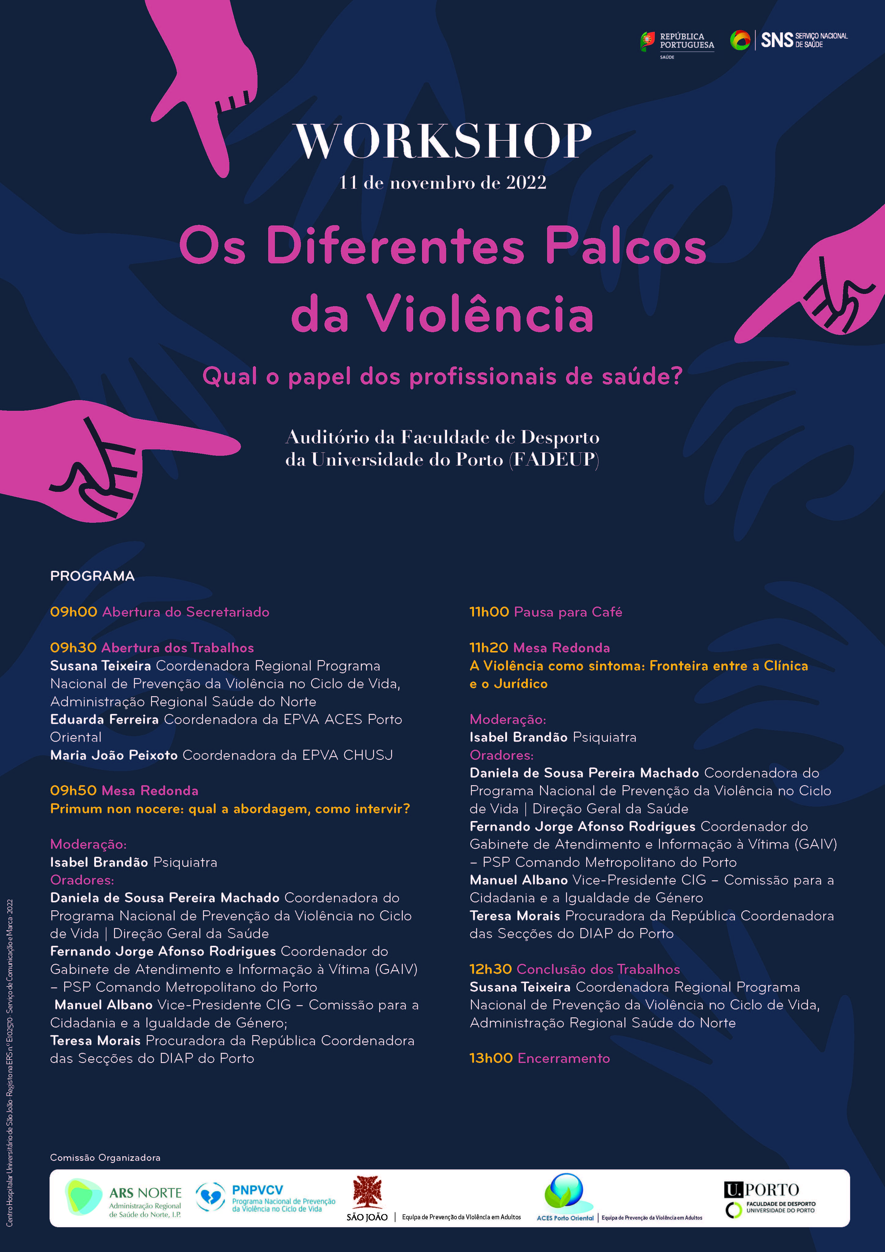 No enquadramento do Dia Internacional para a Eliminação da Violência Contra as Mulheres – dia 25 de novembro de 2022, as Equipas de Prevenção da Violência no Adulto (EPVA) do Agrupamento de Centros de Saúde do Porto Oriental e do Centro Hospitalar Universitário São João vão realizar, no próximo dia 11 de novembro de 2022, o Workshop “Os diferentes palcos de violência: Qual o papel dos profissionais de saúde”.