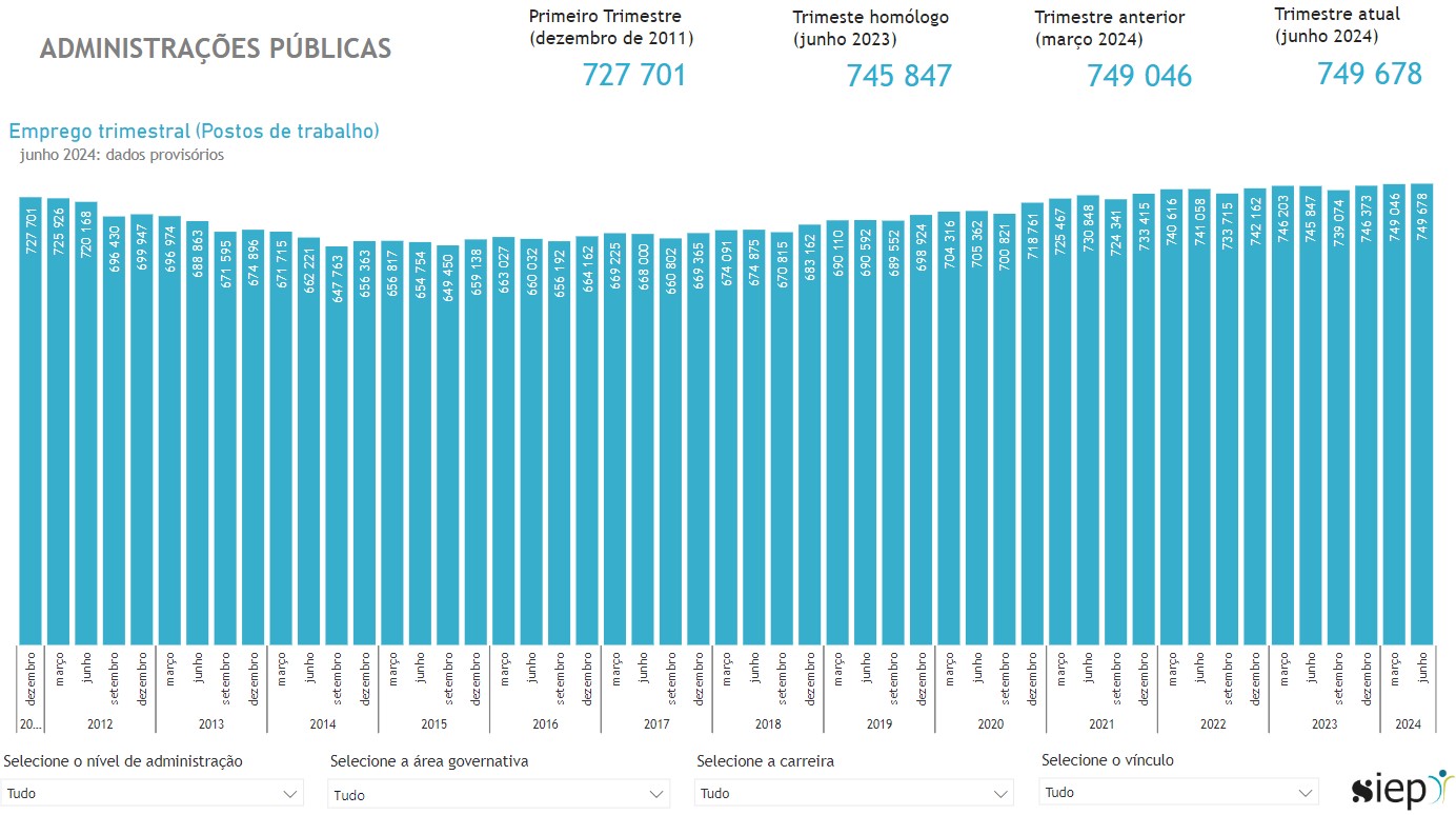 A 30 de junho de 2024, o emprego no setor das administrações públicas situou-se em 749 678 postos de trabalho, correspondendo a um aumento de 0,5% (+3 831 postos de trabalho) em termos homólogos, de 0,1% face ao trimestre anterior (+632) e de +3,0% (+21 977) face a 31 de dezembro de 2011 (início da série).